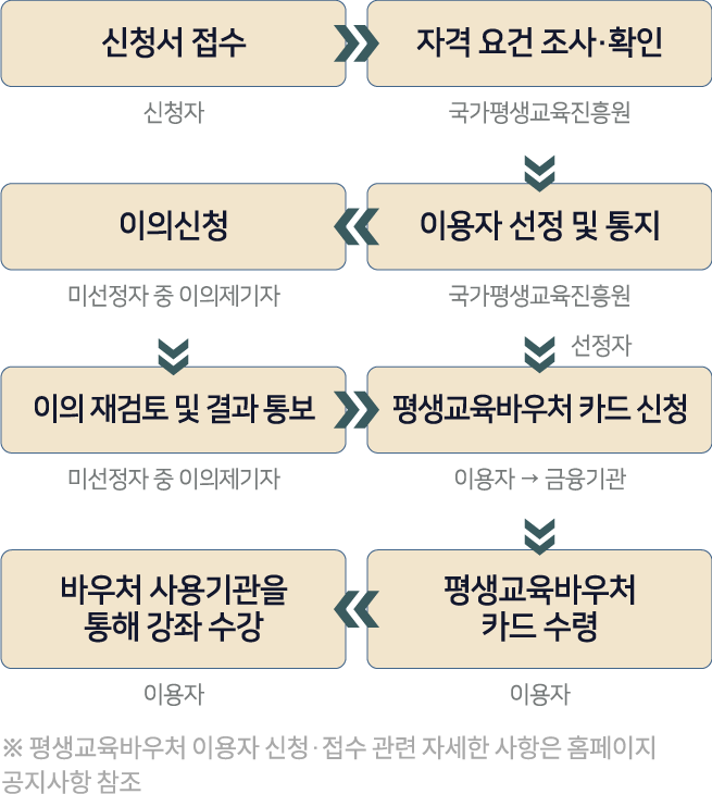 · 학습자가 본인의 학습 요구에 따라 자율적으로 학습 활동을 결정하고 참여할 수 있도록 정부가 제공하는 평생교육이용권입니다.